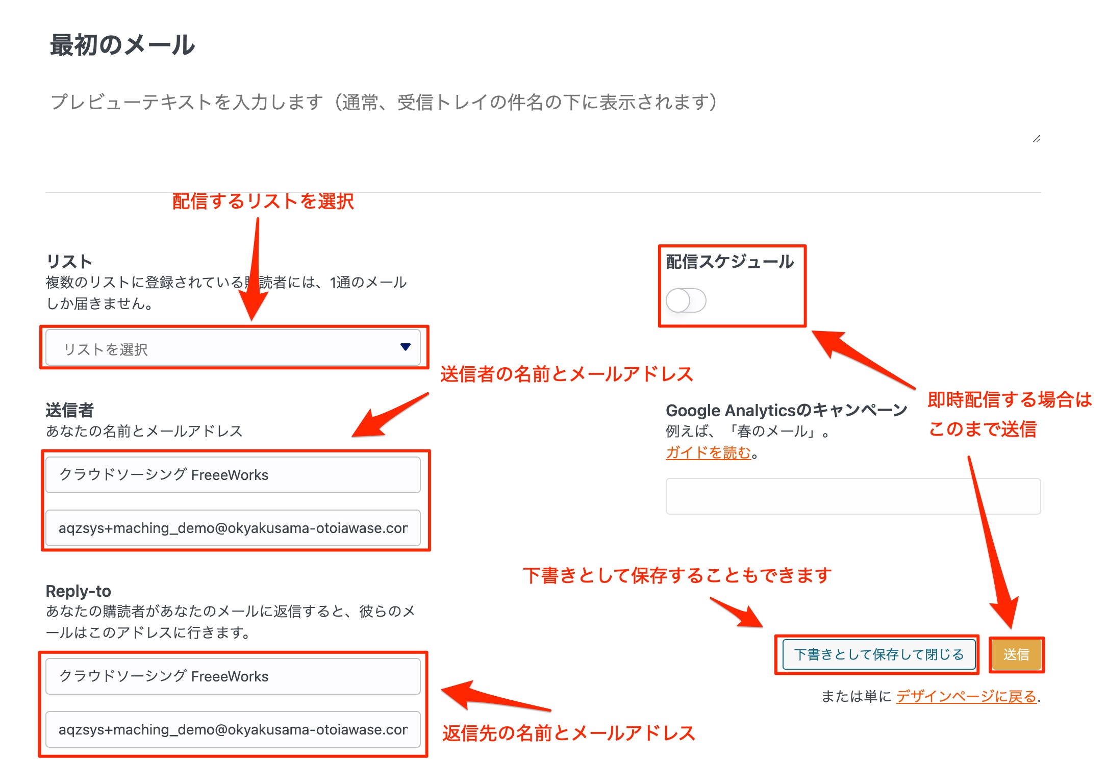 選択した雛形の本文を編集し、タイトルを入力したら【次】をクリックし、続いて配信の設定を行います。