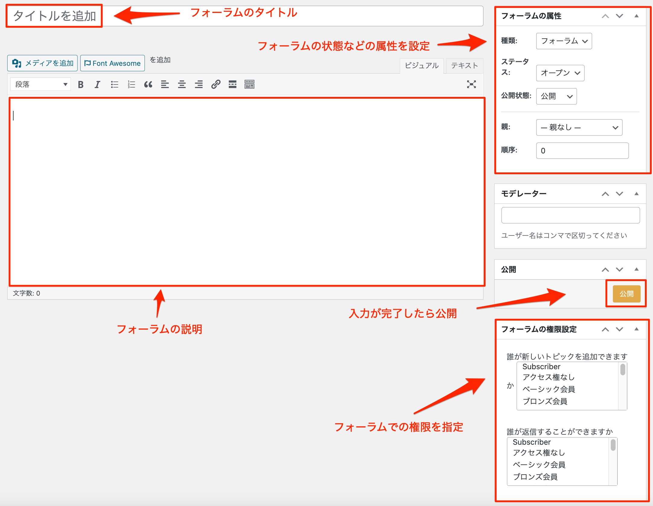 新しいフォーラムを作成するには、運営管理画面から【フォーラム管理】>【新規追加】をクリックし、フォーラムのタイトルや説明、フォーラムの属性を設定します。